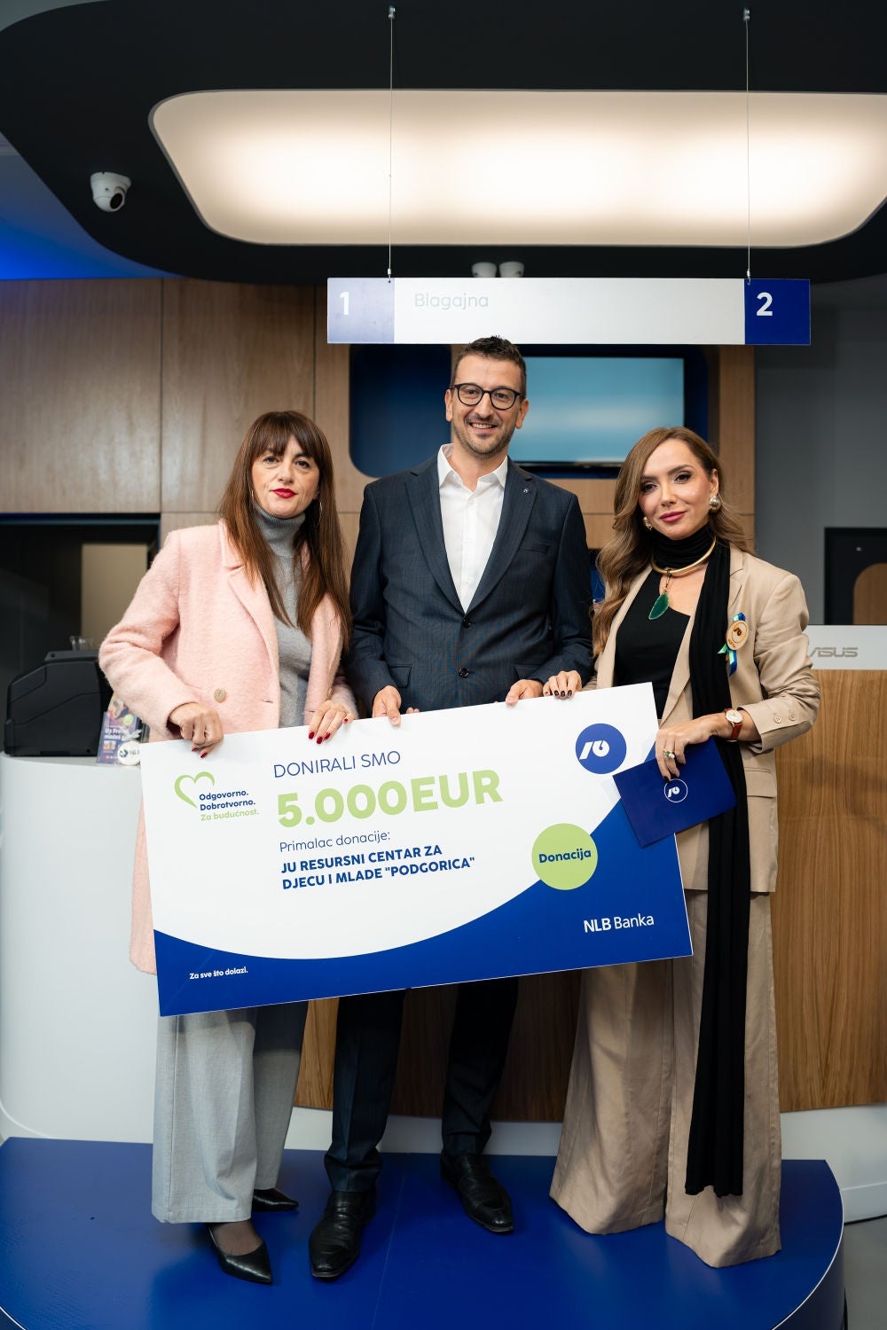 U duhu vrijednosti koje promoviše i u znak zahvalnosti zajednici u kojoj posluje, NLB Banka je povodom otvaranja renovirane filijale uručila donaciju u iznosu od 5.000 eura Resursnom centru za djecu i mlade „Podgorica“. Ovom donacijom banka želi da doprinese unapređenju uslova za obrazovanje i razvoj djece i mladih, potvrđujući svoju dugoročnu posvećenost društvenoj odgovornosti i podršci lokalnoj zajednici.